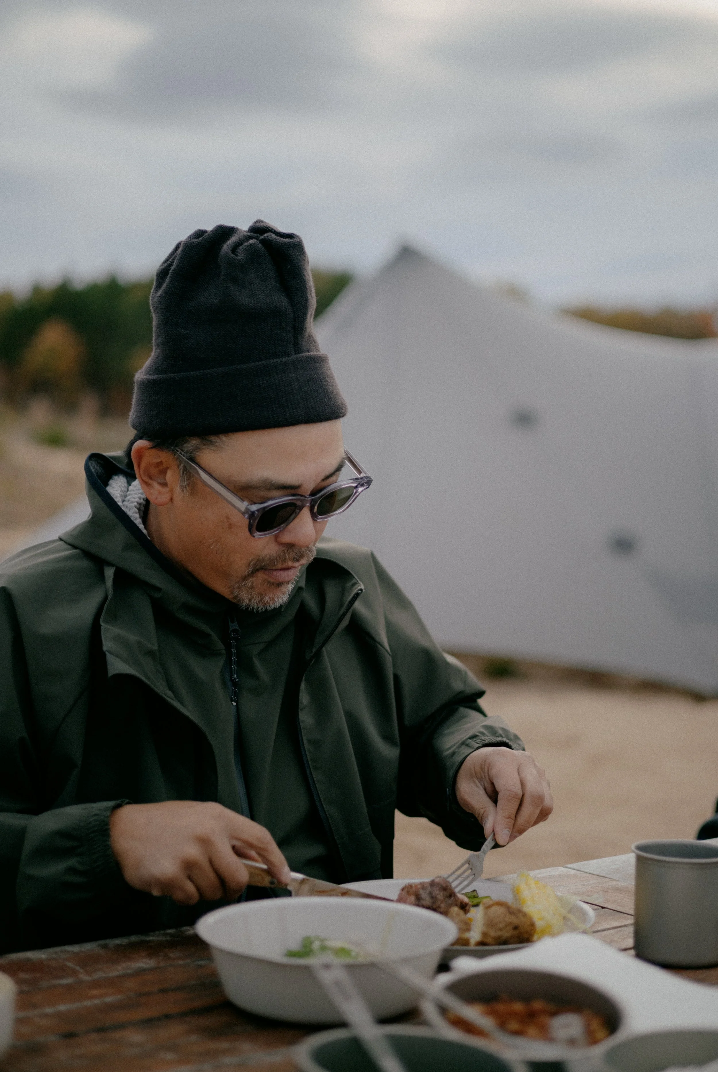 With the days work done and nothing left to do but listen and dream, finding ourselves around a table breaking bread with friends new and old is one of the last great luxuries of camp. Isaiah in the Basecamp Wool Mesh Snap Hoody woven in Italy, cut and sewn in New York alongside Ray in the Basecamp Field Suit constructed with a 3-layer recycled Cordura shell.