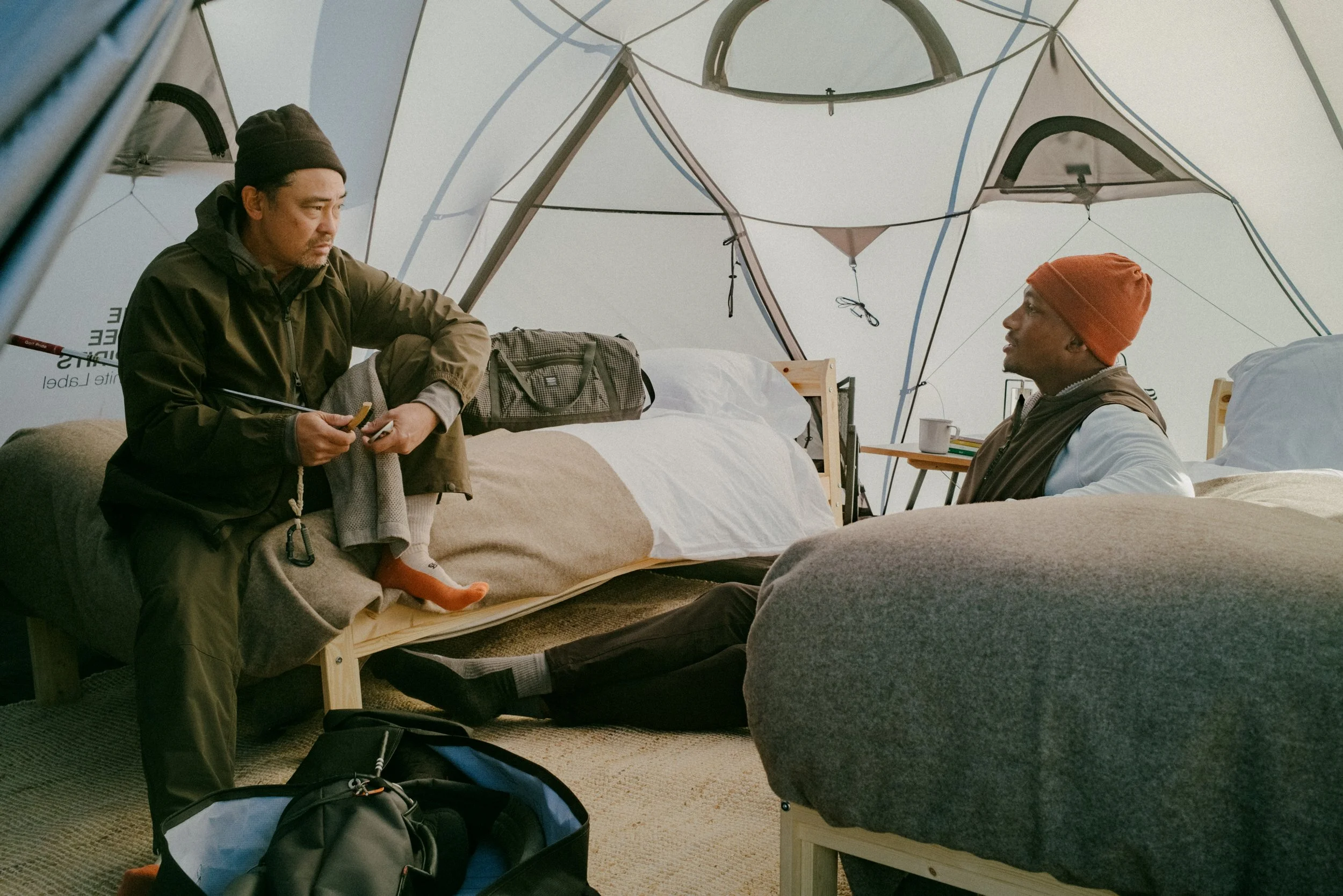 A quiet morning at camp. Ray (left) wearing the Basecamp Field Suit by Sentinel and knit cap made with Makwa Studio in charcoal. Isaiah (right) wearing the MajoTech Vest by Sentinel. Also in frame: the basecamp travel bag by Sentinel, Dyneema duffle made with 1733 in black, and the Basecamp blanket made with American Woolen Company.