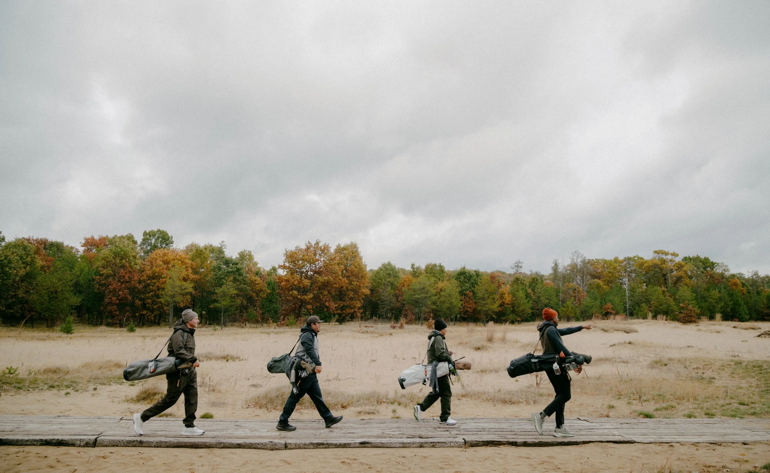 Opposite: Isaiah catches one on the screws in the Basecamp Vest and Deltapeak Thermal. Above: Ray, Clark, Trey, and Isaiah examine clark’s hickory relics. Also pictured, the Basecamp Walker series manufactured with Mackenzie Golf Bags (Beaverton, OR).